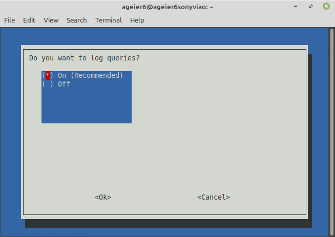 The Installer will then ask you if you want to log queries. The answer to this is yes. You are going to want to know which clients on your LAN are querying what and why they are doing it. This helps give you a better idea of what your computer, tablet, phone, etc. are doing when you browse the Internet. It also shows you what your devices are doing when you are NOT browsing. I have a cheap WiFi camera in my house that was constantly sending queries. The log helped me identify this and eliminate it. Select "On" and go to the next page.
